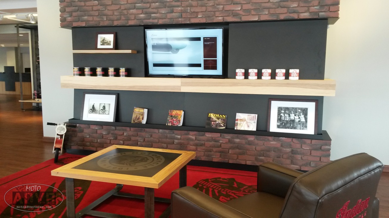 The showroom opens up with surrounding glass windows for ample lighting, wood floors, several Indian bikes about, with a “fireplace”, leather couches, and coffee table as the center piece. A nice “homey” touch on a motorcycle shop if I do say so, much less industrial compared to pretty much every other dealer I’ve been to.