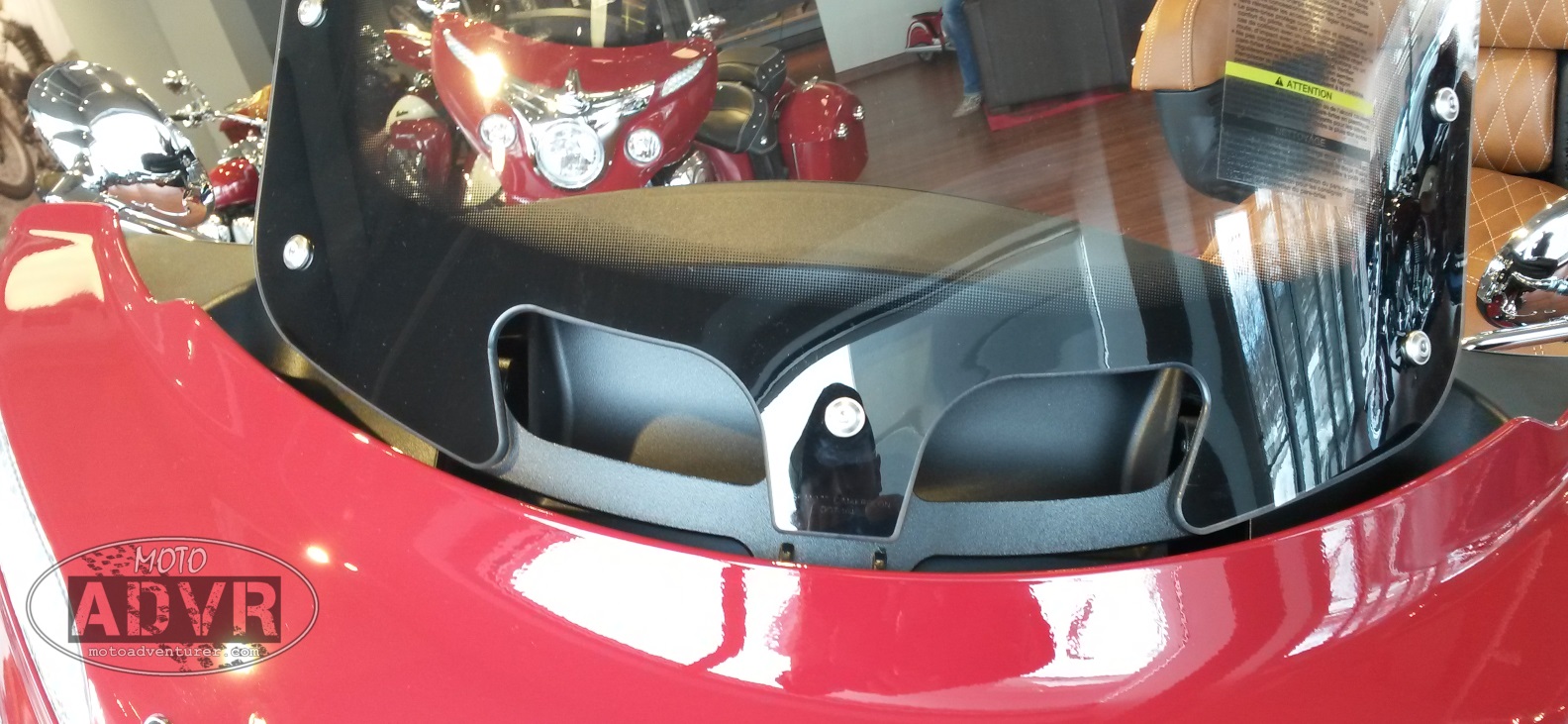 not my cup of tea, I was still impressed with the on-screen menus, unobtrusive digital user interface, cruise control, internally wired handle bars, and general fit and finish of the controls, especially after looking over the Victory touring bikes. I was extremely impressed with the new adjustable windscreen, which I had completely forgotten was adjustable until the sales rep started thumbing through the options for me and changed the height setting; credit to Indian for making the mechanics of an adjustable screen overly subtle. Beyond electronic adjustability, I’m also impressed that