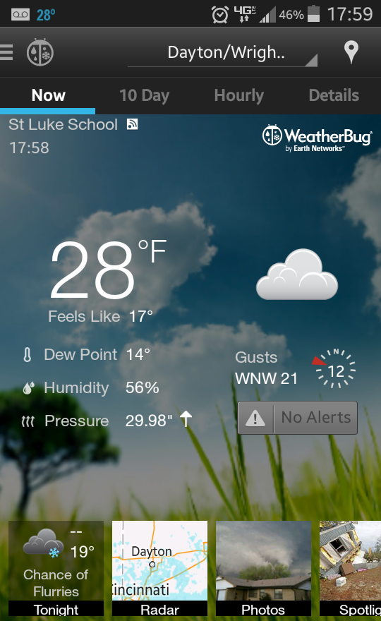 Arriving at work I was invigorated from the chilly yet otherwise exceptional commute to the office. Suddenly around 10 AM I looked out the window and noticed the gloomy clouds off into the distance. Not long after 11, a pretty significant amount of flurries were swirling outside the window. Not the first time the weatherman has been a bit “off” so I checked the forecast again to make sure I didn’t need to flee back to the house for four wheels. Shockingly, the forecast had been revised since my 7 AM visit, now showing 0% chance of precipitation for the rest of the day. Scoffing at the hourly forecast, I looked at the radar, noting the blue splotches all over the city. Weather.com tends to be the “most” accurate of all the local weather venues, so I checked the “future-cast”, no snow or rain storms anywhere over Dayton between noon and 5. The irony here is that the snow CURRENTLY falling in Indiana was completely missing from the future-cast model (that’s a bad sign). Worse still, I noticed the temperature was still a good 5 degrees below the forecasted temperature for 11 AM.