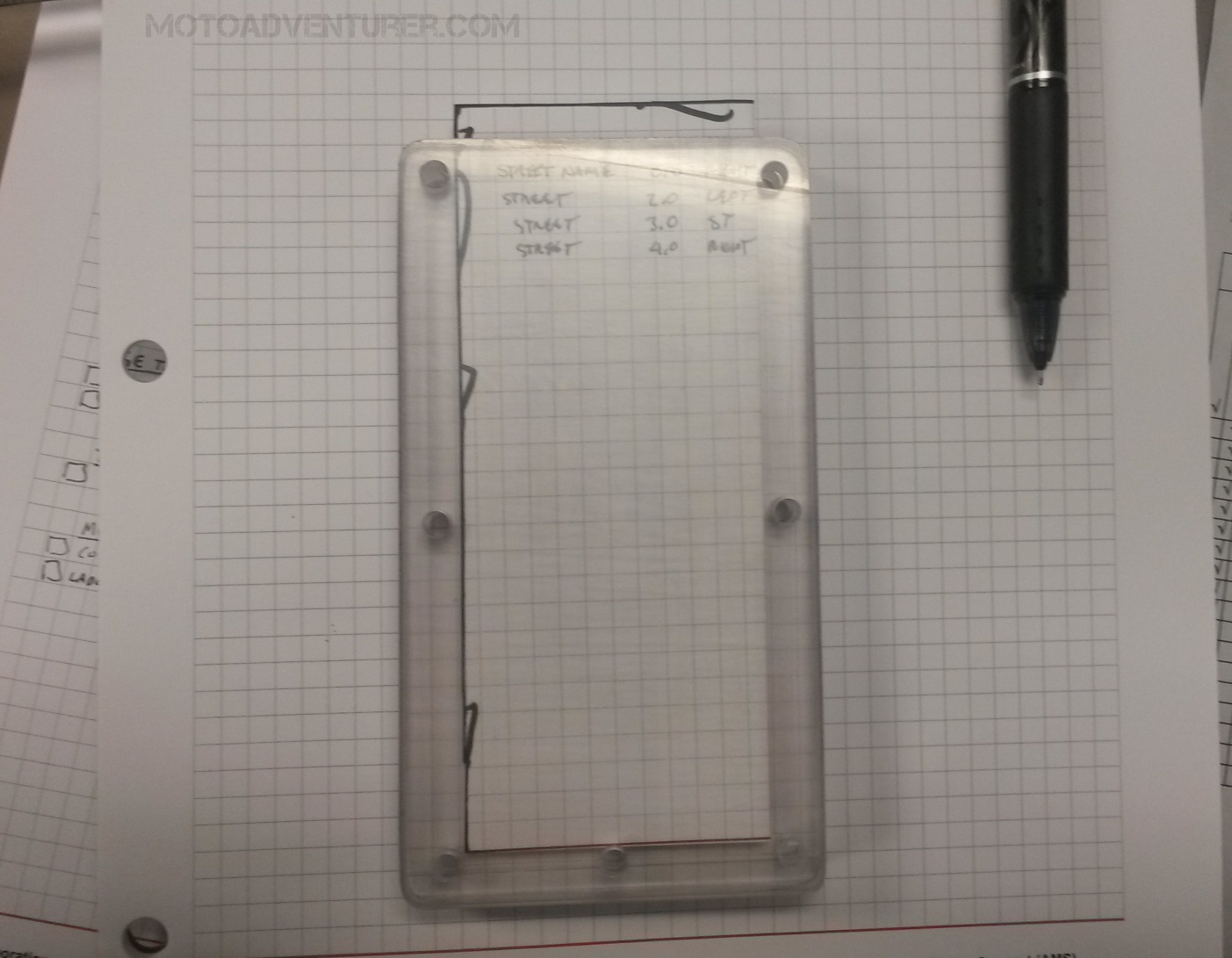 Obviously neither alternative is currently working so well for me, so I need a more “advanced” solution. MotoADVR_DrawingBoardWhile surfing the web I was impressed that there are actually two “affordable” mini-roadmap readers (Touratech and Moose racing), however I still wanted to branch out on my own and make something. My good buddy Jeff reminded me that I have a way with acrylic; it seemed to make sense that I could cut out a couple pieces, put my directions inside, screw them together, then use the RAM mount on my handlebars. The lightbulb immediately went off and I hit the drawing board.