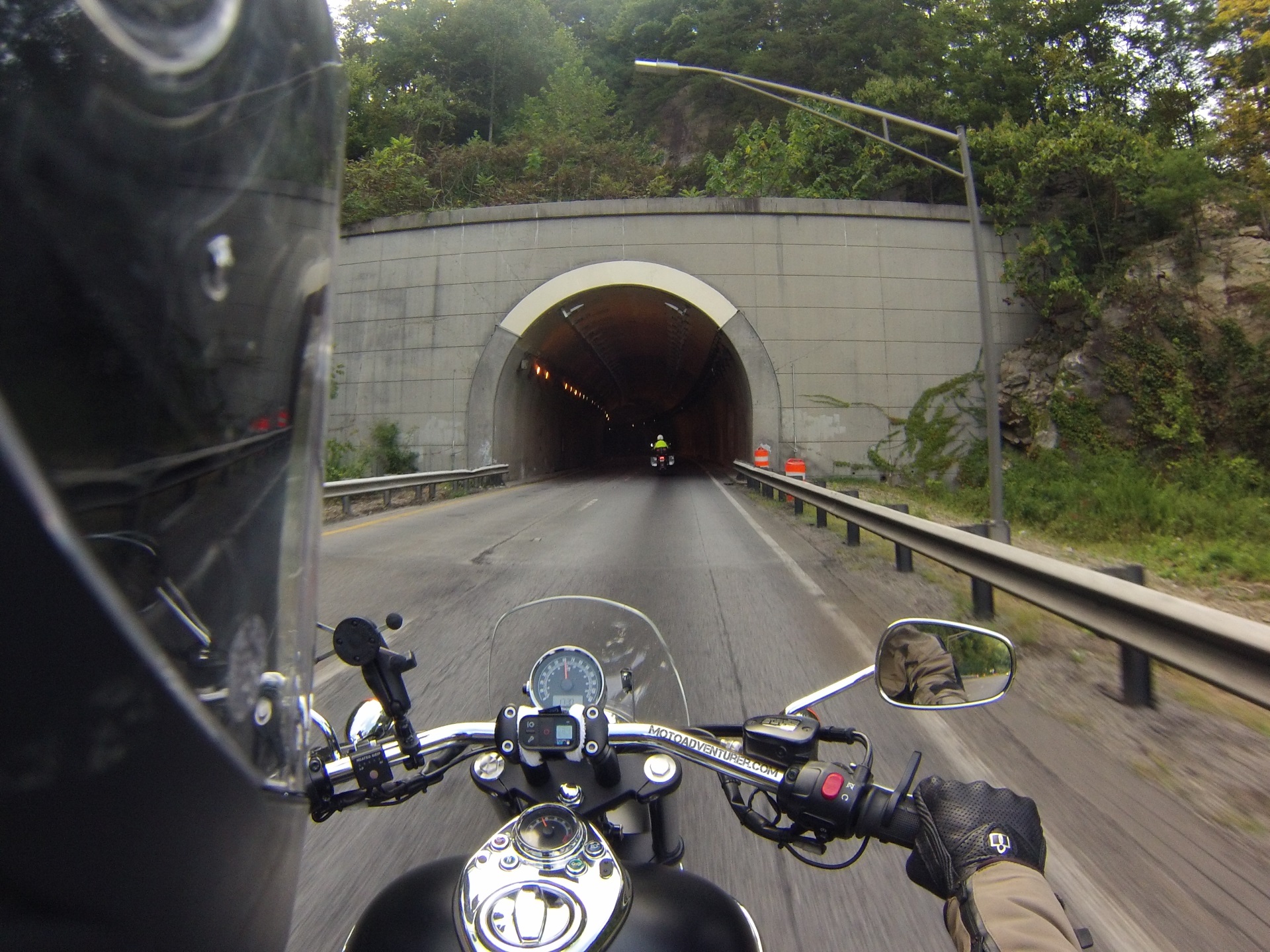 who don’t know, the tunnel along 25E is a 4,600 foot, four-lane, dual-tube tunnel, bored through the mountain connecting Middleboro, Kentucky, to Cumberland Gap, Tennessee. While 25E doesn’t pass through Virginia, I’m told the nearby connecting two-lane roads where the three states converge at Cumberland Gap is well worth exploring on two wheels.