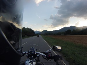 Getting off the freeway, eleven hours in, we were finally on the home stretch, US-19 through Maggie valley and Cherokee, then a hot skip across US-74, and finally North Carolina Route 28 into Stecoah to the Lodge. To Jon’s credit, I counted about 12 rain drops on my visor, a good lesson in optimism. I snapped a few photos along US-19.