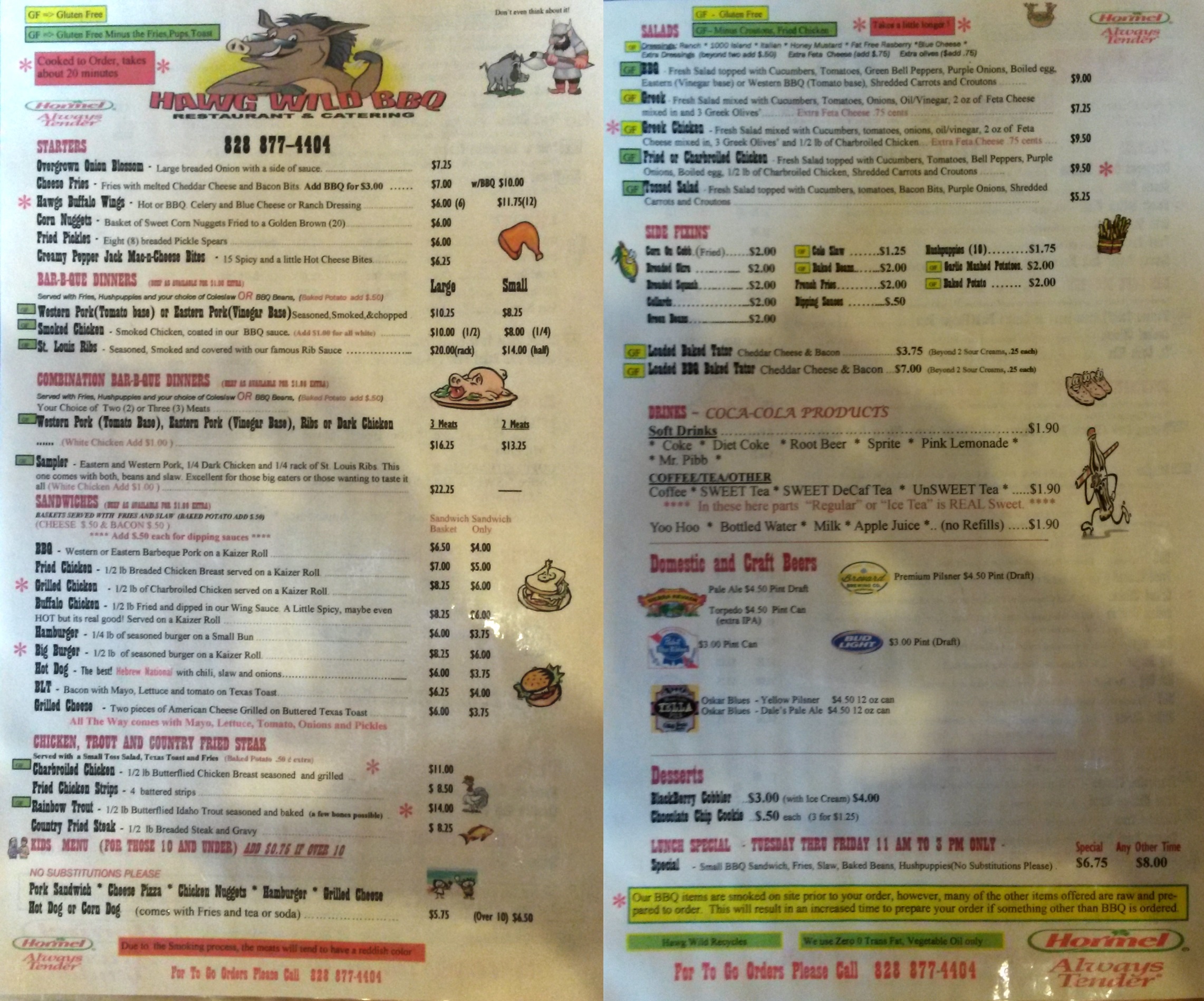 Just a few more miles down 276 we stopped for lunch at the Hawg Wild Barbecue at the corner of US-276 and US-64. I love “Soul Food” so I was eagerly looking forward to the meal at hand. I’ve been milling over the best way to describe the restaurant, but after some time, the best thing I can come up with is like a southern, rustic… pizza hut (or “Frickers” for local Daytonians). There were maps on the tables, covered with glass, with simple table arrangements with BBQ sauces and condiments. The service was very friendly (especially for such a large group); there was definitely a southern family feel to the place; just as I’d hope for in these parts. Looking over the Hawg Wild menu, I spotted the “go-to”. The menu included a loaded hot dog, and fried pickles; yes, this was a barbecue restaurant, but rules are rules.