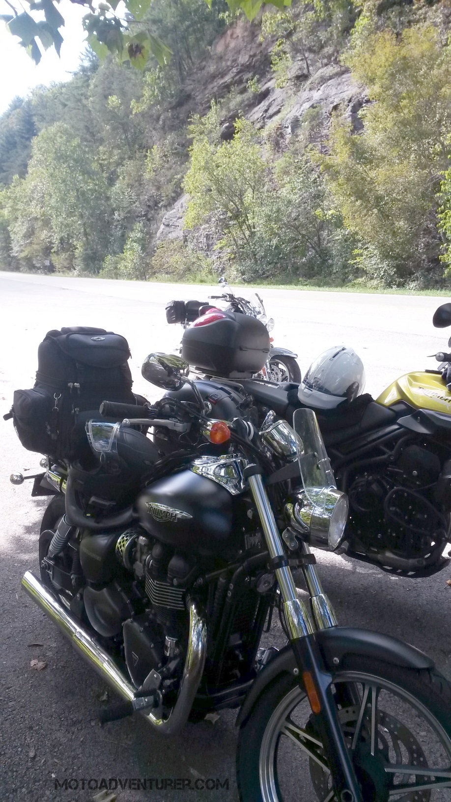At the Shell station in Robbinsville, it was obvious that the cycle of tourism never stops at Deal’s Gap; Triumph rider’s headed home from their rally as new groups began arriving. Pulling up to the pump I snapped a quick photo of a Ferrari gassing up, we past at least one more on a way into Tennessee.