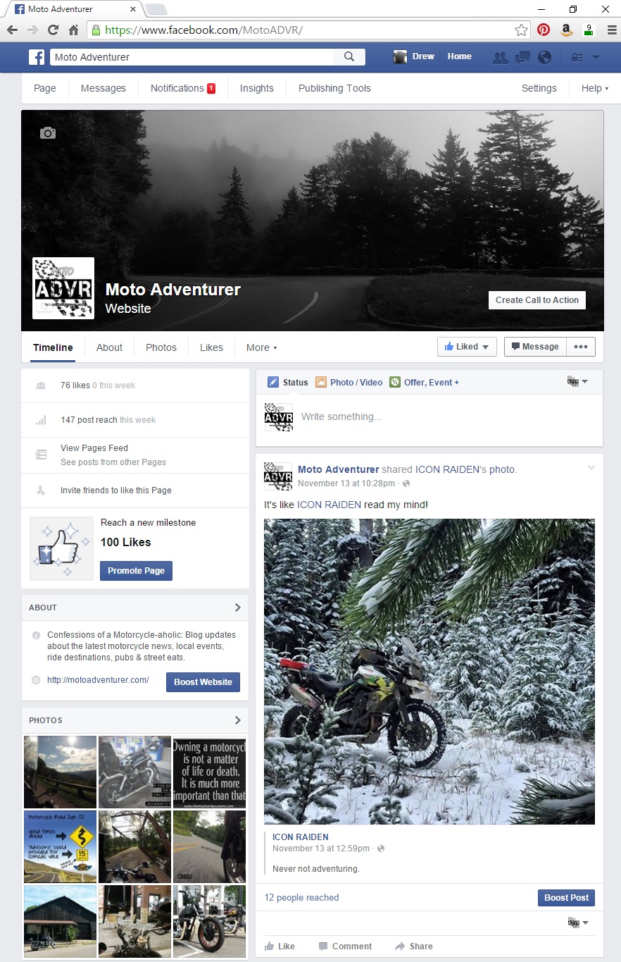 Not long after starting the Blog I realized that it might be wise to have other social media accounts that offer other outlets for Moto Adventurer. Some of you may already follow the Facebook page; there was a time that Facebook was a fantastic outlet for blogs and businesses, but Facebook now uses some sort of cryptographic algorithm that makes it extremely difficult to attract “organic” traffic to your page without paying for advertising. That aside, I still try to post what I can on the Facebook page if it seems pithy, but for the most part, it’s the blog auto-updating the most recent post. In a perfect world, where I am writing on the blog as a full-time job, I would run all of the social media platforms more effectively, but in the meantime it takes a lot of effort to stay employed, write, meanwhile update Instagram, Pinterest, and Facebook. That being said, if you prefer updates from Facebook instead of E-mail, head over to MotoADVR on Facebook and follow the page.