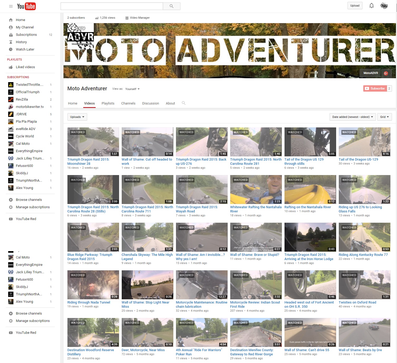 MotoADVR on YouTube was a must after my wife bought the GoPro for my birthday. While I have a reasonable amount of storage on Word Press (my Blog Domain), YouTube is a much better depository for videos considering the ease of sharing. Similar to Facebook, I can only update YouTube when I’ve cut new video content, so building a unique YouTube audience is somewhat of a challenge. However, like Facebook, at some point I’m hoping to have the resources to provide additional (and unique) content to YouTube as well (maybe “VLogging”?). So, if you’re looking to get the first looks at the latest videos, Subscribe to the MotoADVR YouTube channel and you’ll get a sneak peek at the next blog posts coming up.
