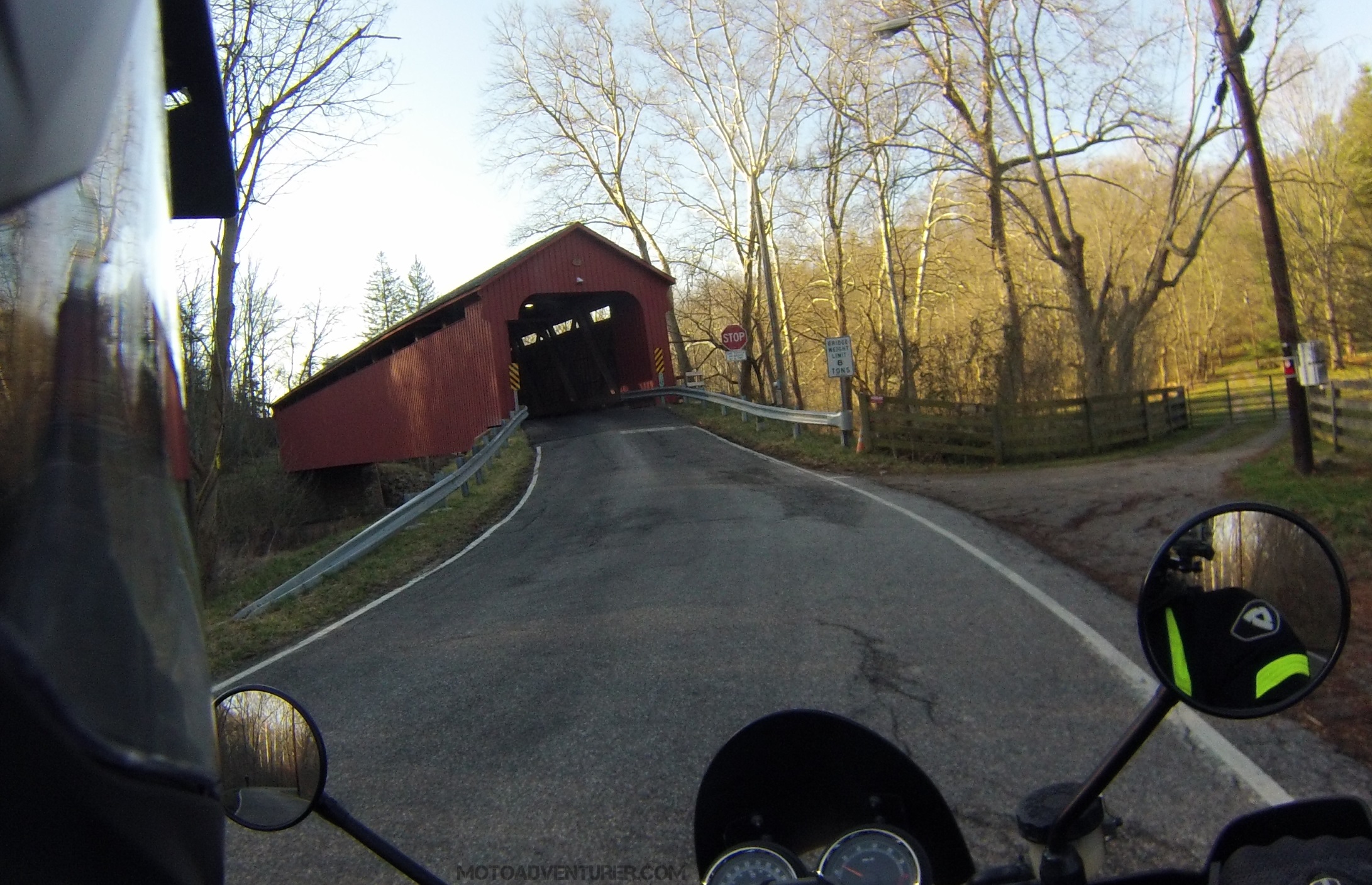 The return trip was unfortunately not as eventful as the ride down. Pressed for time, I forced myself to endure some really long straight sections of OH-133 to make up time. I did however, include OH-763 out of Aberdeen, and a recently discovered North Pole Road, which as luck would have it, included yet another covered bridge. North Pole road put me in a position to navigate around US-68. Rooting around through the Rever ride planner the day prior, I discovered that “Old” US-68 is quite the twisty road down by the river valley. Much like KY-435, it appeared that Old 68 had also just received a fresh layer of asphalt. us68-mail-pouch-barn-motoadvrOld 68 turned out so nicely, I might go as far as to say it was one of the best roads of the day, probably the best “new” road I encountered. From the top of Old 68 in Georgetown it was an assortment of oddly named county roads up to OH-133 in Bethel, and then on to Owensville. In Owensville I simply couldn’t pass up Belfast-Owensville Road, an excellent twisty section that actually runs between at least three different creek beds. From the fun stuff around Owensville it was another set of mostly unremarkable roads until I was back in the Little Miami River corridor. Having made relatively good time, I went ahead and hit all four hair-pin turns in Oregonia before finally heading home.