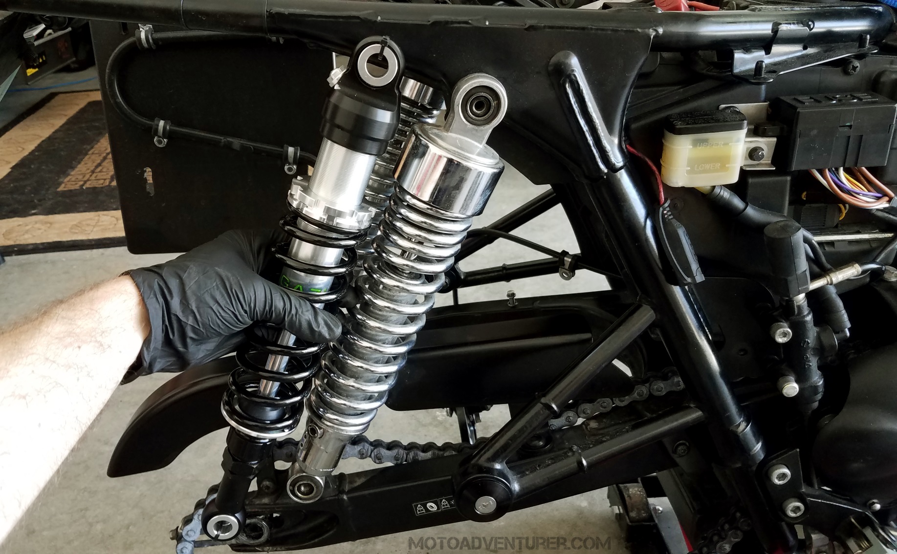 I had ordered some preload adjusters that were guaranteed to fit, but guess what, they didn’t, so on went the original top nuts. That will be revisited at some point as some of the adjusters require trimming the spacer tube to retain factory length at full length. I’ve wondered if they fit without doing that, and if so, is there a need to add more fork oil? Things to try later, perhaps.
