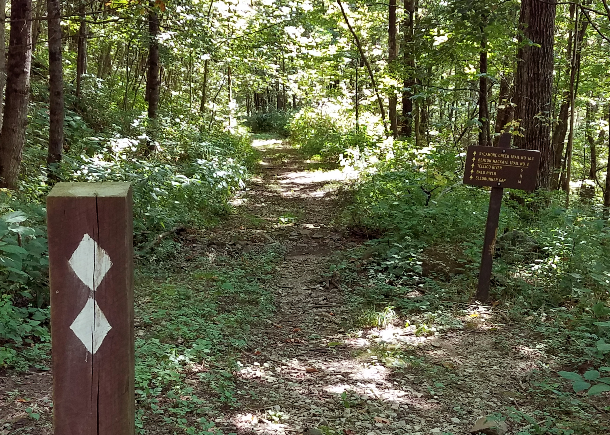 Feeling adventurous and foolishly following my GPS, I turned south off 217 and onto a road I’d not ridden in the past. The gravel narrowed as I crossed a couple of concrete bridges and after a few uphill hairpins I arrived at a sign inscribed “Sycamore Trail”. The two diamonds on the trail marker suggested that Rosie might not finish the journey if we proceded. Considering I was solo, I decided better of it. Looking around I saw the trail continued in the other direction up the mountain. After several bends up the hill and some washed-out gravel, I arrived at Whigg Meadow.