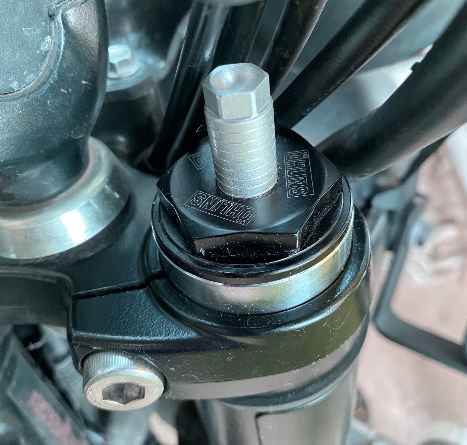Anywho, A&J was selling a set of Ohlins S36 TR538 twin shocks, Ohlins fork springs, Free Spirit +30mm travel kit, and Ohlins fork pre-load adjusters for a bundled price. The parts were gently used for like 500 miles or less so I jumped on them. I’d been wanting to add the extra travel to the front forks for a long time, essentially giving the front end of the bike 6″ of overall travel. Equating that at the back of the machine is still a bit elusive, but at the moment, the new Swedish shocks add a little extra over stock, along with increasing the overall length to balance out the gains in the front. The bike handles better on the road and also gains a significant lean angle now that the entire bike is an inch taller.