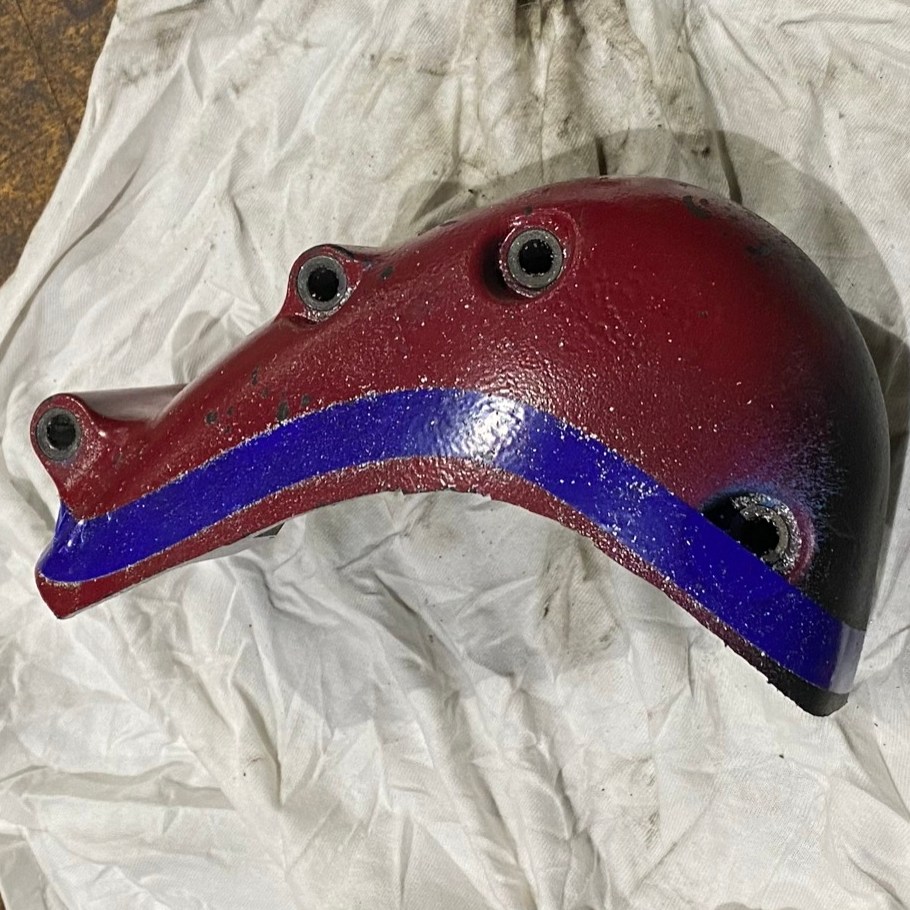 When the cover arrived, I dunked it into the solvent tank at work to get all the road grime and grease out of it. Fortunately, that also helped to remove some of the ungodly silver rattle-can paint adorned to it. Unfortunately, that revealed the ugly red rattle-can treatment it received beforehand. I took some “fine-line” tape and drew a line on the cover for where I wanted to cut loose the excess casting material and headed over to the band saw. With some patience and a lot of cutting and grinding, I got the cover down to an acceptable shape. Because I’m a stickler for originality, I decided to add a few “lightening” holes to the cover before final sand and paint. I put the cover in the blast booth to remove the ridiculous red in preparation for a fresh coat of black paint. To my surprise, some of the original black powder coat was still there. 4 coats of semi-gloss primer and it was ready for installation. I cut the cover in a manner that actually excluded the 5th mounting hole at the bottom. I wasn’t sure if that screw had any bearing on the subsequent cover, so I found a shorter bolt to take up its stead, painted it black, and plugged it in.