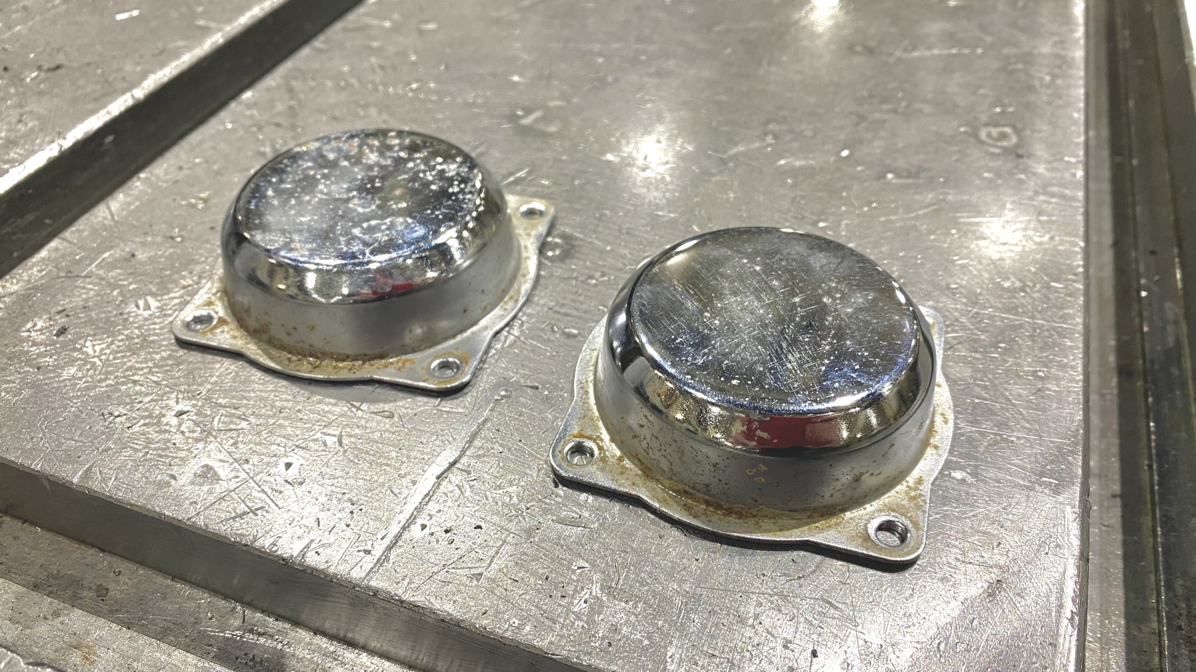 Since I was already spending my lunch break in the shop, I decided it was time to remove the rusted chrome from the throttle body covers, along with applying a permanent coat of black paint to the headlight grill. I mentioned from day one I wanted to remove as much chrome as possible from the bike, and after enduring the Ride-365 challenge, the throttle body covers looked awful. Since I was already spraying the new sprocket cover, it was easy to toss these parts in the blast booth and give them a refresh. The anodized coating on the skid plate was also fading after thousands of miles of punishment from road grit and gravel. I decided to blast the skid plate as well, and instead of painting it, I liked the look of naked aluminum so I left it. Hopefully it holds up.