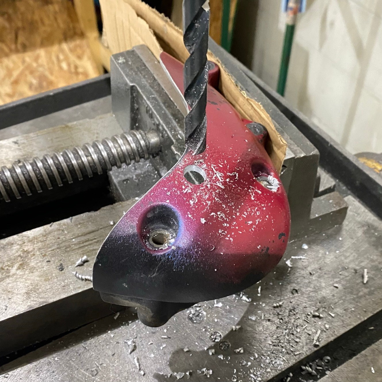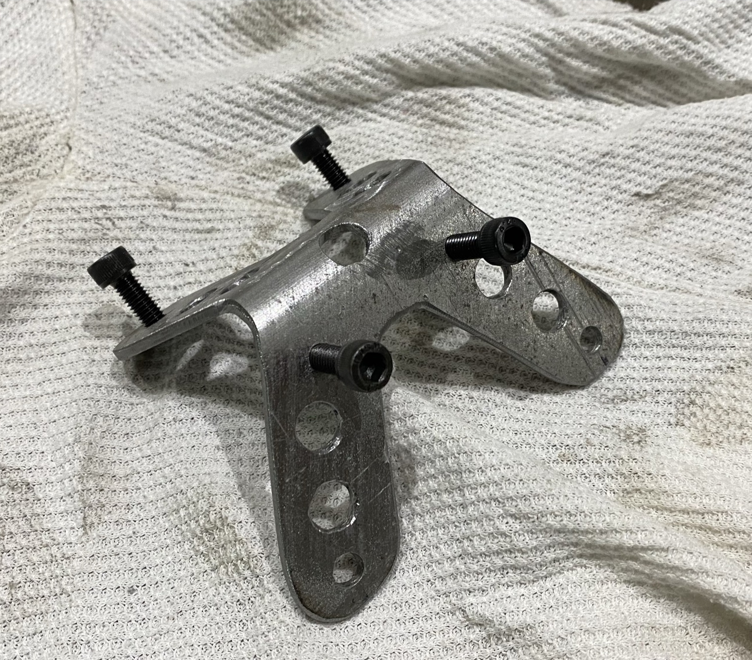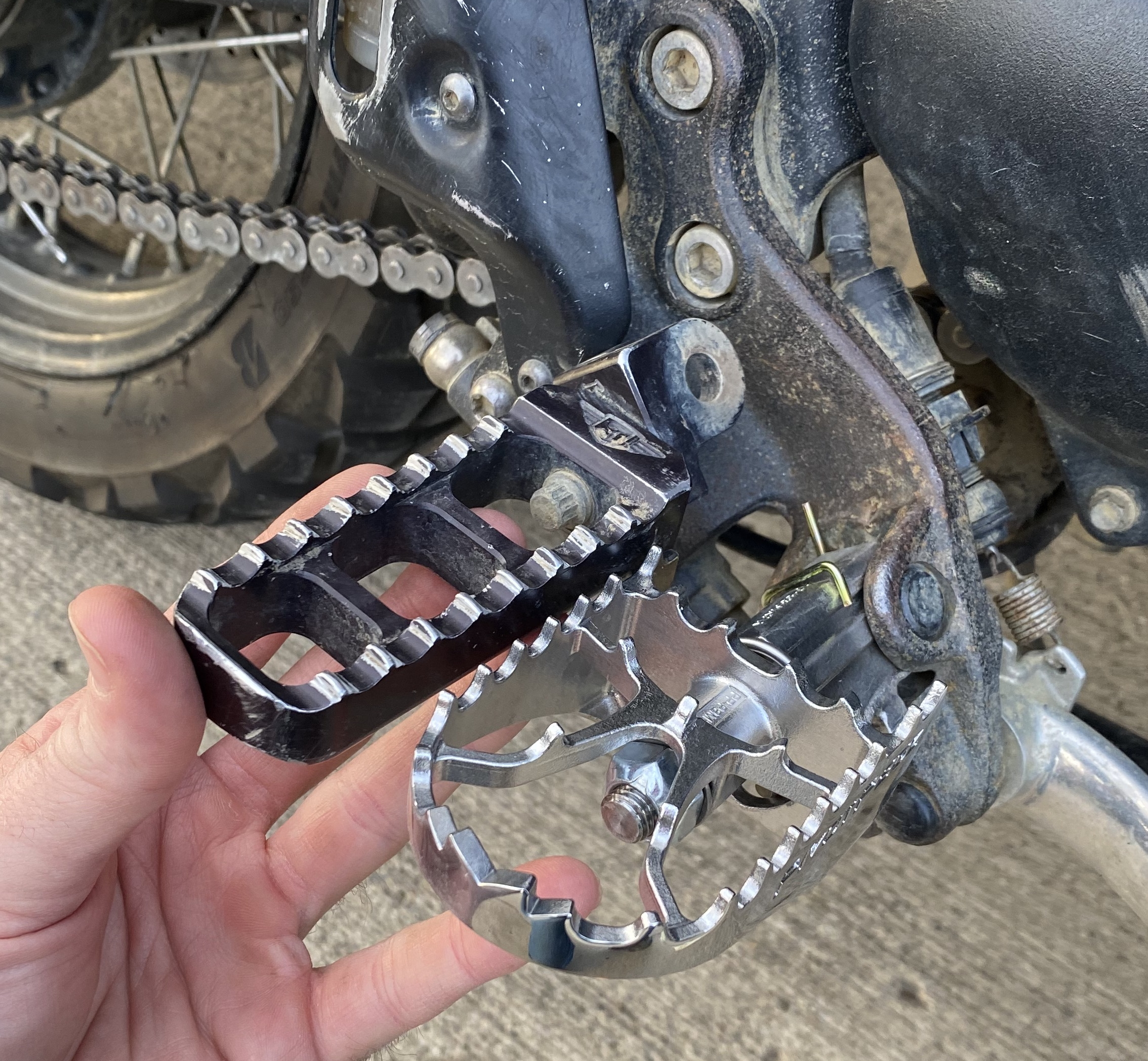 After the suspension upgrade, I took the Scrammy to Red River Scramble 2020. While blasting around contrary creek below Lago Linda Hideaway, I cut a corner a little too close and my left peg had a run-in with a healthy log. I kept the bike up and enjoyed the rest of the day, but my foot was a bit sore for the next week and I swore the bike felt funny. When I got home I realized I’d bent the aluminum mounting point in the Joker Machine pegs I’d installed back in phase 2.