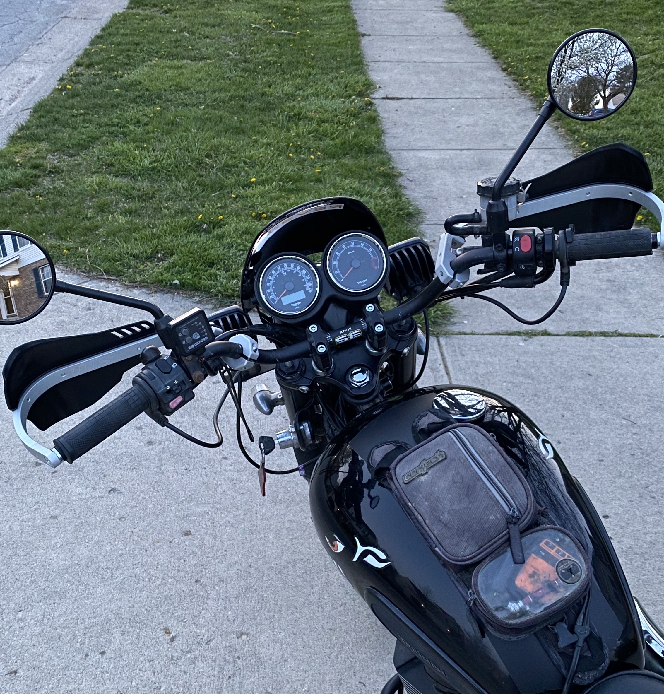 While that proved partially correct, I know many tiger owners with significant slides where those handguards protected their bike just fine. Ultimately I wanted harder wrap-around protection that would be more robust against tree limbs and whatnot as my eyes were on taking the Scrambler deeper into the woods. The fact I lost the threaded bar ends of the stock bars also made this decision easy.