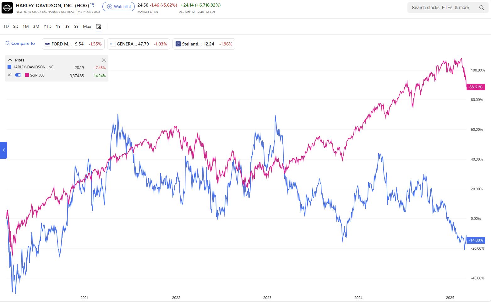 With Levatich “stepping down”, board member Jochen Zeitz was appointed interim CEO. Paired with internal turmoil, Harley stock fell further amid the pandemic market shock. In May 2020, Zietz was formally given the title of CEO; coincidentally Harley was removed from the S&P 500 and placed into the S&P Mid-cap 400 category in June. In the spring of 2021, Pan America models arrived on dealer floors and stock prices nearly doubled their value, rising above S&P levels. Hailed as “The top-selling ADV bike in North America”, stocks teetered around the S&P 500 until spring 2023. In the time since, stock values fell almost 75% to today’s value, overall down 14% from early 2020 when Zeitz took the reins. Yet, during Zeitz’s tenure, the S&P 500 has gained 88% value, with the mid-cap 400 gaining 60%.
