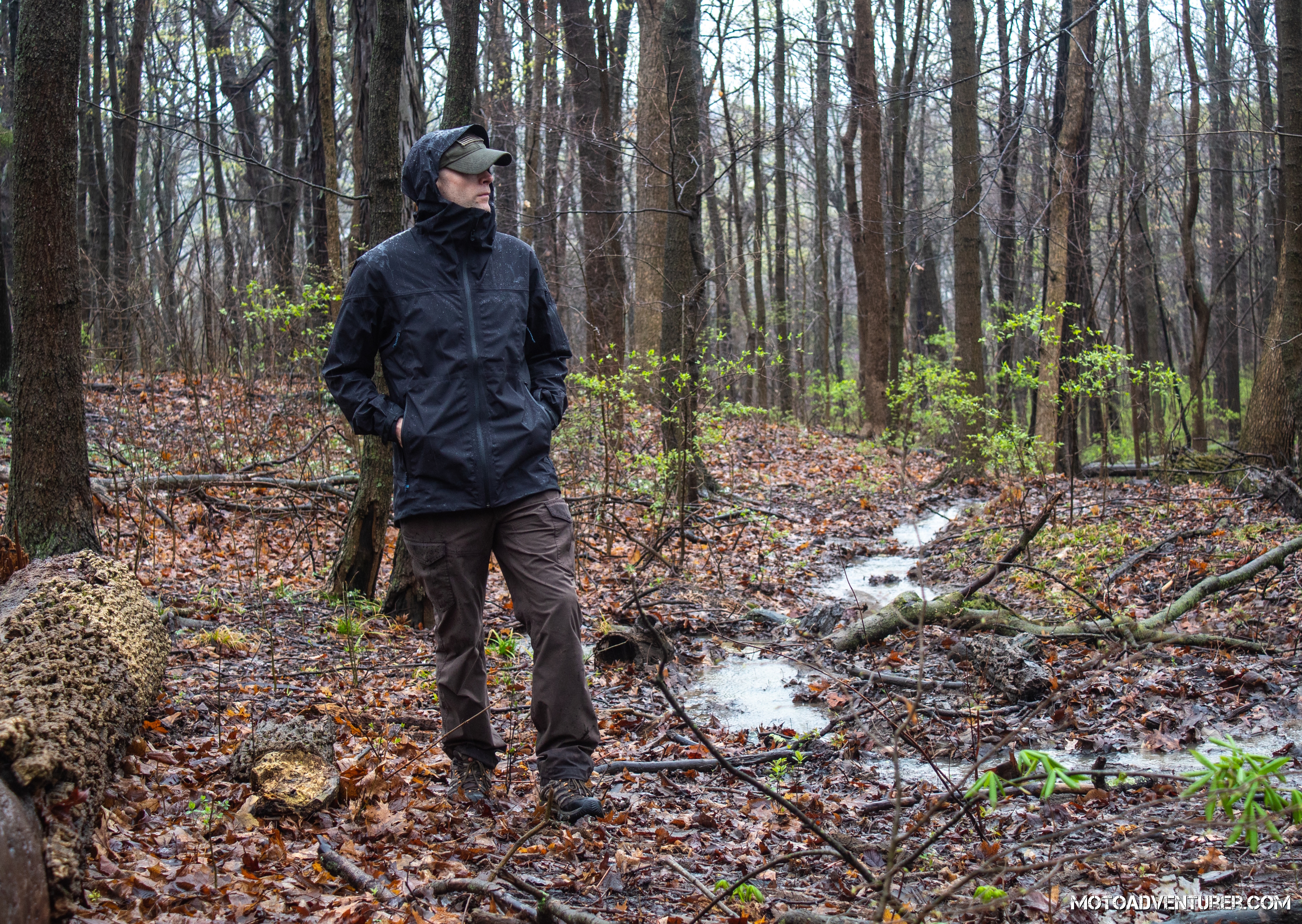 Rucked up and enjoying the spring rain on a solo walk in the woods, I was again pleasantly surprised to find it was only raining outside my jacket, while not sweltering on the inside which is a more common experience when hefting around a pack whilst battling the elements in a rubber suit. When elevation changes start ramping up, the jacket also has underarm vents to move more air. These vents also zip down to close, ensuring that the zipper start is upstream from falling water. The main closure features a YKK “Aqua-guard” weatherproof zipper including rain gutter and “garages for the zipper pull to prevent water ingress when parked. The main zipper also has reinforced fabric near the chin portion to protect the garment from “high traffic” when adjusting the face cover for ideal comfort.