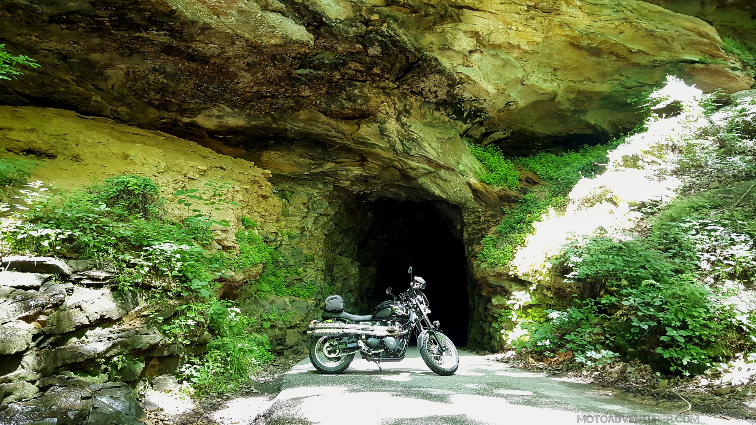 Section 5 begins at a Valero Station just north of West Liberty and runs northeast through rural backroads of Elliot County, ending in Counts Crossroads just west of Grayson. This section is highlighted by twisty single-lane pavement and gravel roads that skirt the watersheds that feed Grayson Lake. There are multiple roadside photo opportunities as the route winds along the cliffsides and remote Appalachian hollers; highlights include Wrigley Arch, Lawton Limestone Mine, and multiple scenic creek crossings. Early in this section, adventurous riders can take a detour onto the “Redwine Challenge” section, which adds about 12 miles to the section. The Townsend road hill climb is rocky and especially rutted by 4-wheel traffic and borders between “intermediate” and “advanced” skills levels depending on recent rains and traffic (See terrain ratings here). On the north end of the route, the Lawton Limestone mine is another photo opportunity with an odd history that’s worth looking up.