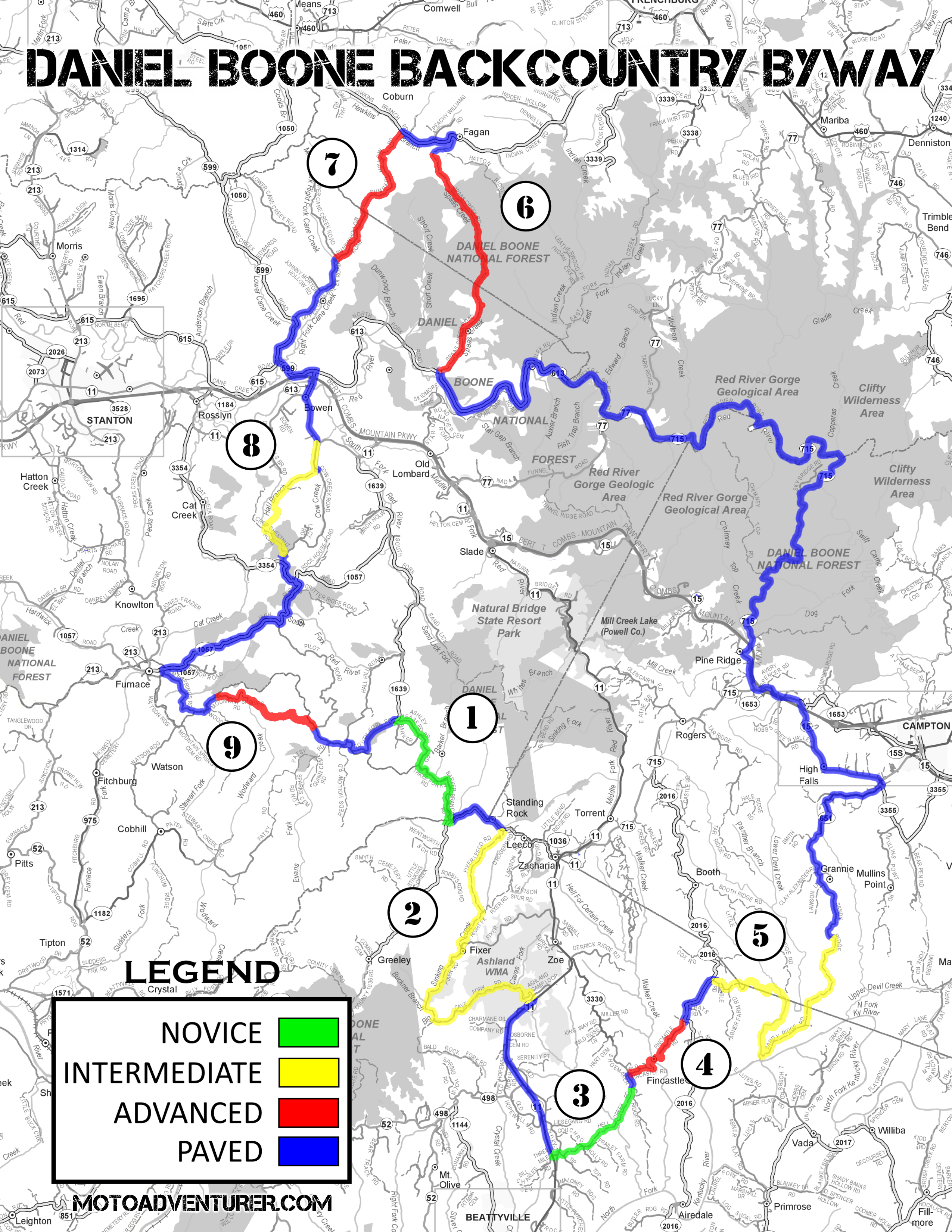 Not all that different from road riding, I find that riding off-road with folks of comparable skill level (or those willing to ride at your level), plays a part in what makes a group ride enjoyable. There’s obviously a lot more to this, and a group doesn’t necessarily need to be composed of uniform skill levels, but it’s a good starting point when putting together a handful of strangers. My biggest concern being, novice riders are sometimes “sucked in” to riding beyond their abilities when following more advanced riders, potentially causing an injury, and in some cases, advanced riders get frustrated when waiting on “slower”, less experienced riders. As far as pavement is concerned, Lemmy over at Revzilla has covered the topic of group riding in great detail, and I recommend taking a few minutes and checking out that article. As far as adventure riding is concerned, for this year’s Red River Scramble I wanted to publish a guide for evaluating your skill level, along with highlighting trail difficulty. This also ties in with how I’ve graded the Daniel Boone Backcountry Byway, and other trails around that area of Kentucky, but more on that in a moment.