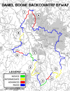 Next, I’ve also taken the time to “rate” each unpaved section of the Daniel Boone Backcountry Byway based on the obstacles you’ll encounter. Admittedly, I’ve combined PSSOR’s “Novice” and “Basic” terrain features into “Easy” for the sake of brevity. If you look at the map posted on the DBBB Guide I published a few months ago, you’ll find each section numbered and color-coded based on difficulty, along with photographs or videos of each section. I plan on providing an abridged, text only, file for download and potentially paper copies for reference at the event in May, just to keep folks from wading in too deep by accident.